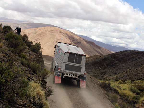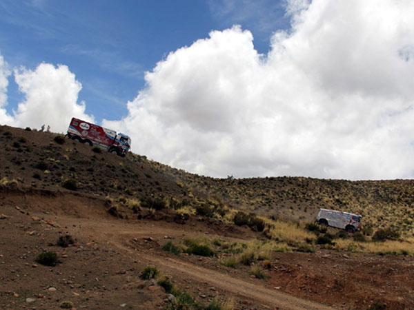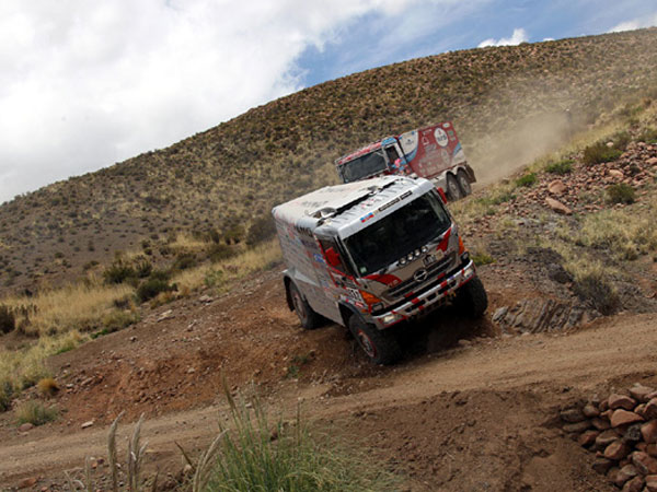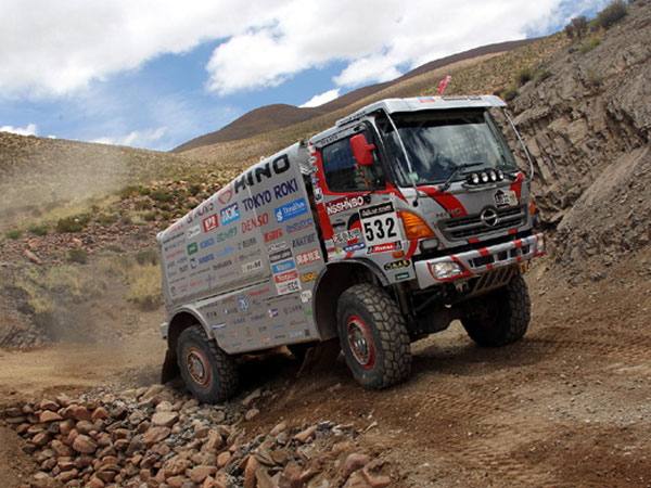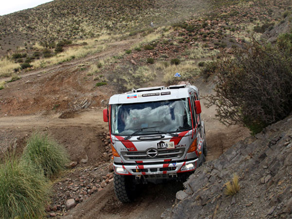 On January 12, the Bikes category set out from Salta, Argentina to Uyuni, Bolivia, while the Cars and Trucks categories raced on a loop course that started and finished in Salta. HINO TEAM SUGAWARA mechanics fully refreshed the two HINO500 Series trucks during the rest day yesterday. Today, the trucks delivered stunning performance again competing against its oversized rivals, with Car 1 moving up in accumulated overall rankings from 27th to 25th.