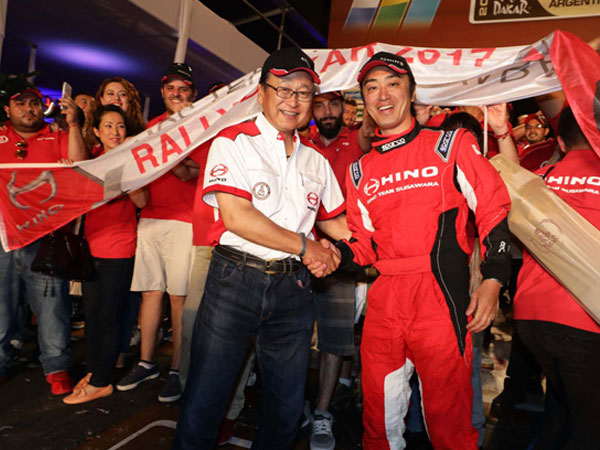 Contestants of Dakar Rally 2017 crossed the finish line in Buenos Aires today on Jan. 14, bringing the fierce competition over the past two weeks to a close. Of the two HINO500 Series trucks that HINO TEAM SUGAWARA entered in the rally, Car 2 crewed by Teruhito Sugawara and Hiroyuki Sugiura finished at 8th overall in the trucks category with a stunning performance that posed a real threat to the leading group of larger trucks, and also won its 8th straight victory in the Under 10-litre Class. Car 1 crewed by Yoshimasa Sugawara and Mitsugu Takahashi finished at 29th overall. The team's two HINO500 Series trucks made a 1-2 finish in their class.