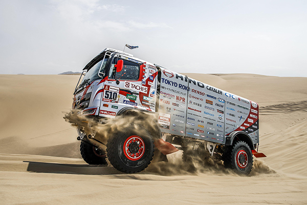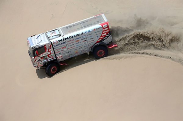 On Jan 16: Contestants raced a 313 km loop course in one of the region's deserts, starting off and ending in Pisco. While Thursday, Jan 17, the final day, will feature a 112 km SS (Special Stage), today was essentially the last day of serious competition. As such, the day turned out to be the final trial for HINO TEAM SUGAWARA's HINO500 Series truck, which the team is aiming to bring to a finish near the top position in the trucks category.
