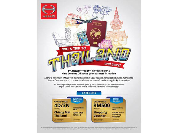 Participants must make a minimum purchase of RM200 (inclusive of GST) in a single-receipt service at any of the nearest participating authorized service center. The purchase must include HINO Genuine Engine Oil and Hino Genuine Parts & Accessories. The proof of purchase can only be valid at selected HINO Authorized Service Center in West Malaysia, Sabah and Sarawak. The contest runs from 1st August until 31st October 2016.