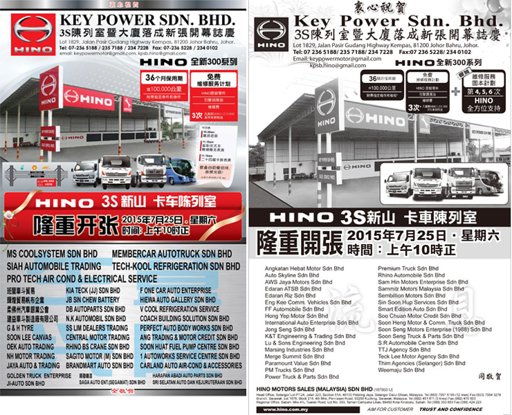 Johor Bahru, Johor, 25 July, 2015 – Hino Motors Sales Malaysia Sdn. Bhd. (HMSM) has recently officiated the opening of its latest addition of 3S dealer (Sales, Service & Spare-parts) located at Lot 1829, Highway Kempas, Pasir Gudang, 81200, Johor Bahru. Key Power Motor Sdn. Bhd. (KPMSB) is now offering Sales, Services and Spare Parts under one roof.